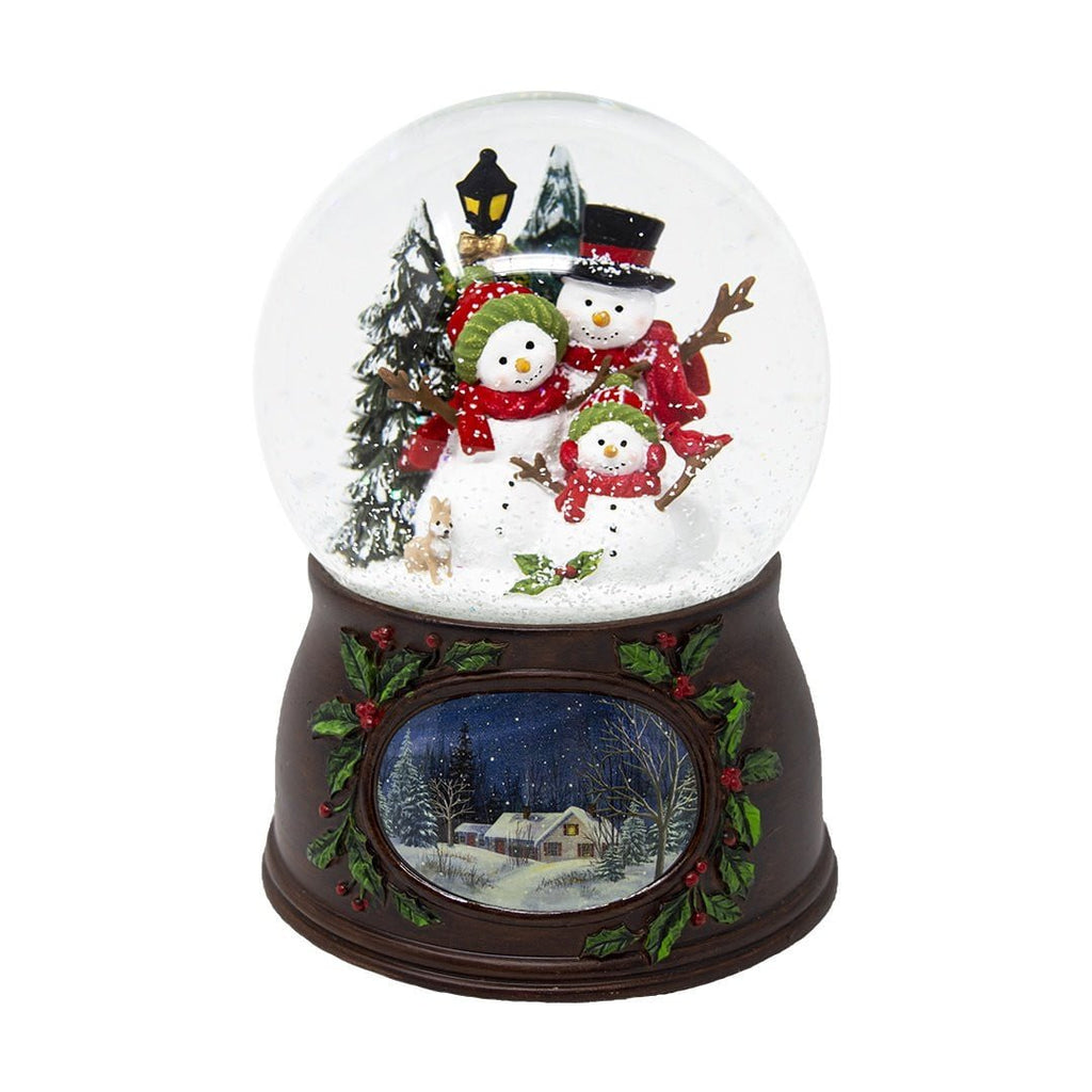 Este globo de Natal muito fofo apresenta uma família de três bonecos de neve com chapéus e luvas, aconchegados sob a luz de um poste. A cena termina com árvores nevadas ao fundo e a melodia "We Wish You A Merry Christmas" é tocada assim que o mecanismo tradicional é acionado.