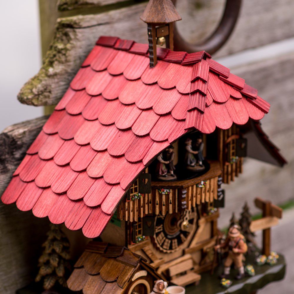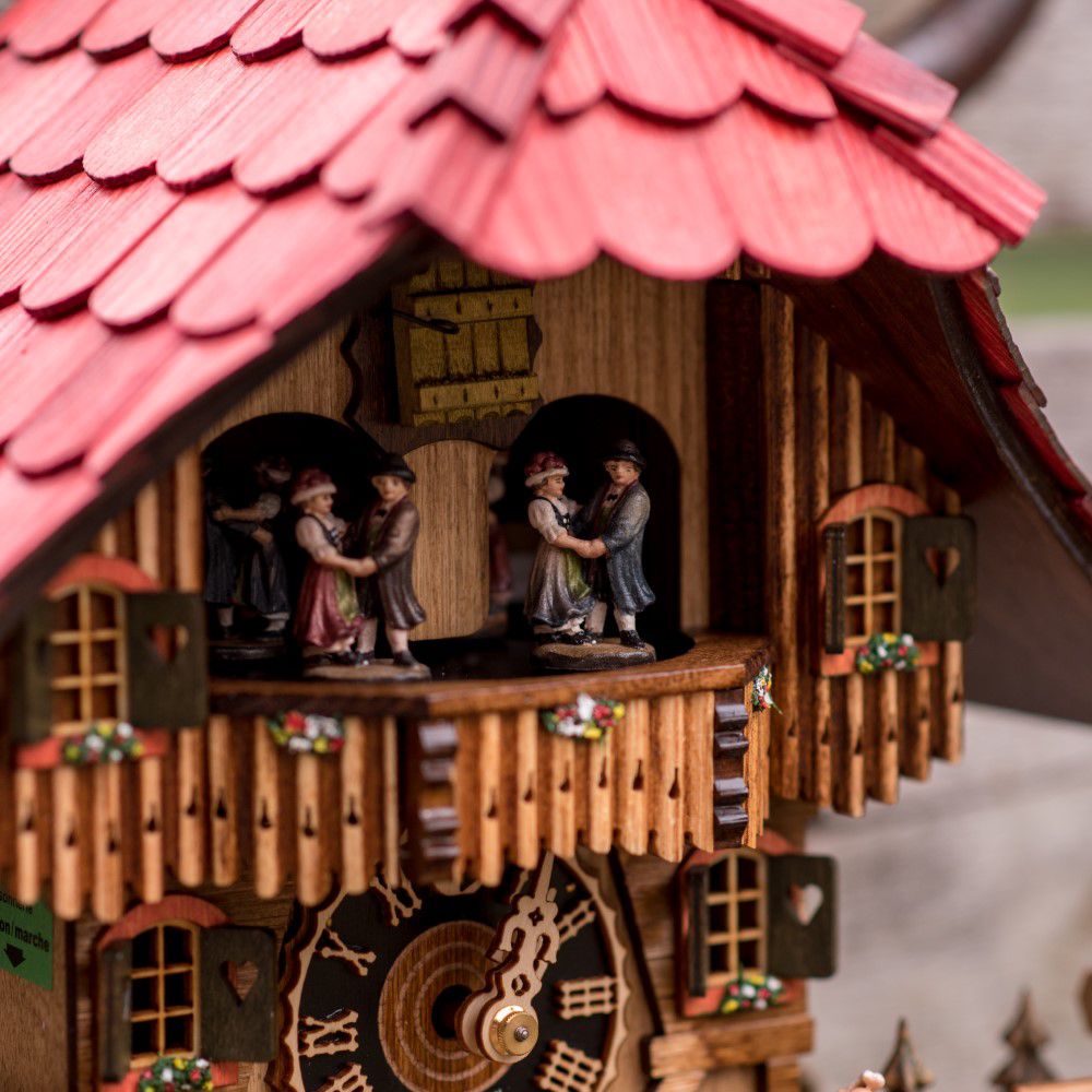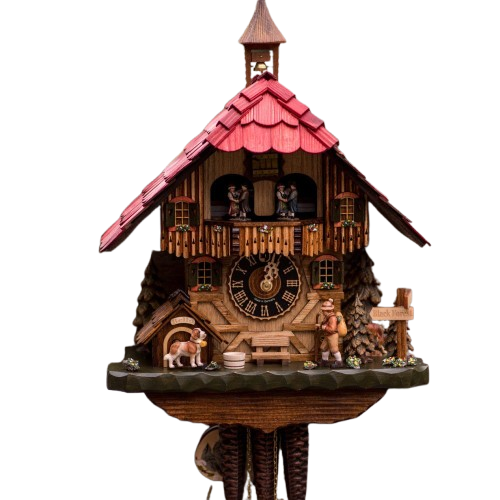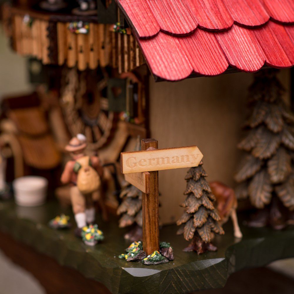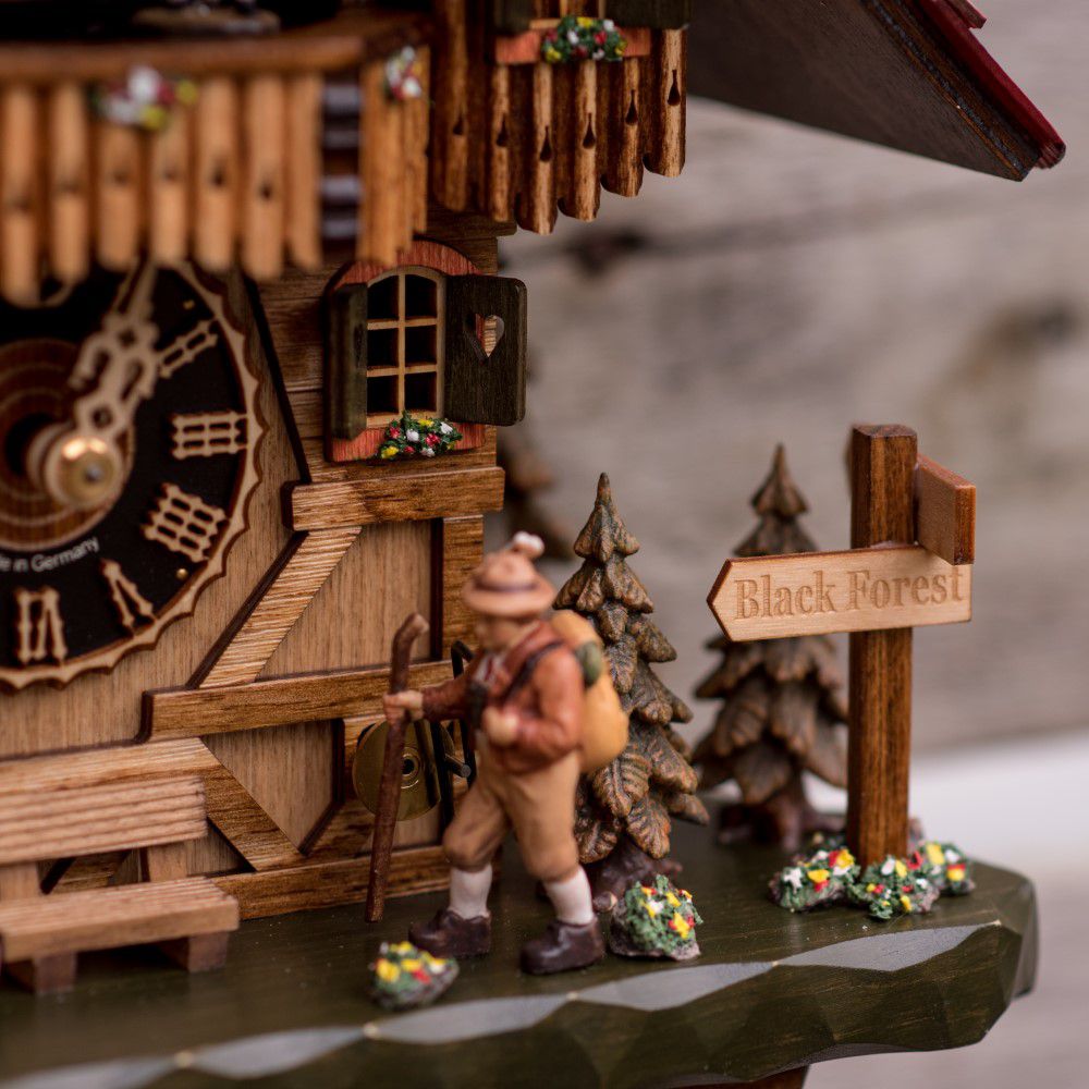 Este relógio cuco estilo chalé temático é entalhado à mão por mestres artesãos do sul da Alemanha. Sua estrutura remete à arquitetura enxaimel, símbolo da herança germânica. O grupo de dança se movimenta ao som da melodia germânica, enquanto o cachorro salta e o peregrino movimenta sua bengala.