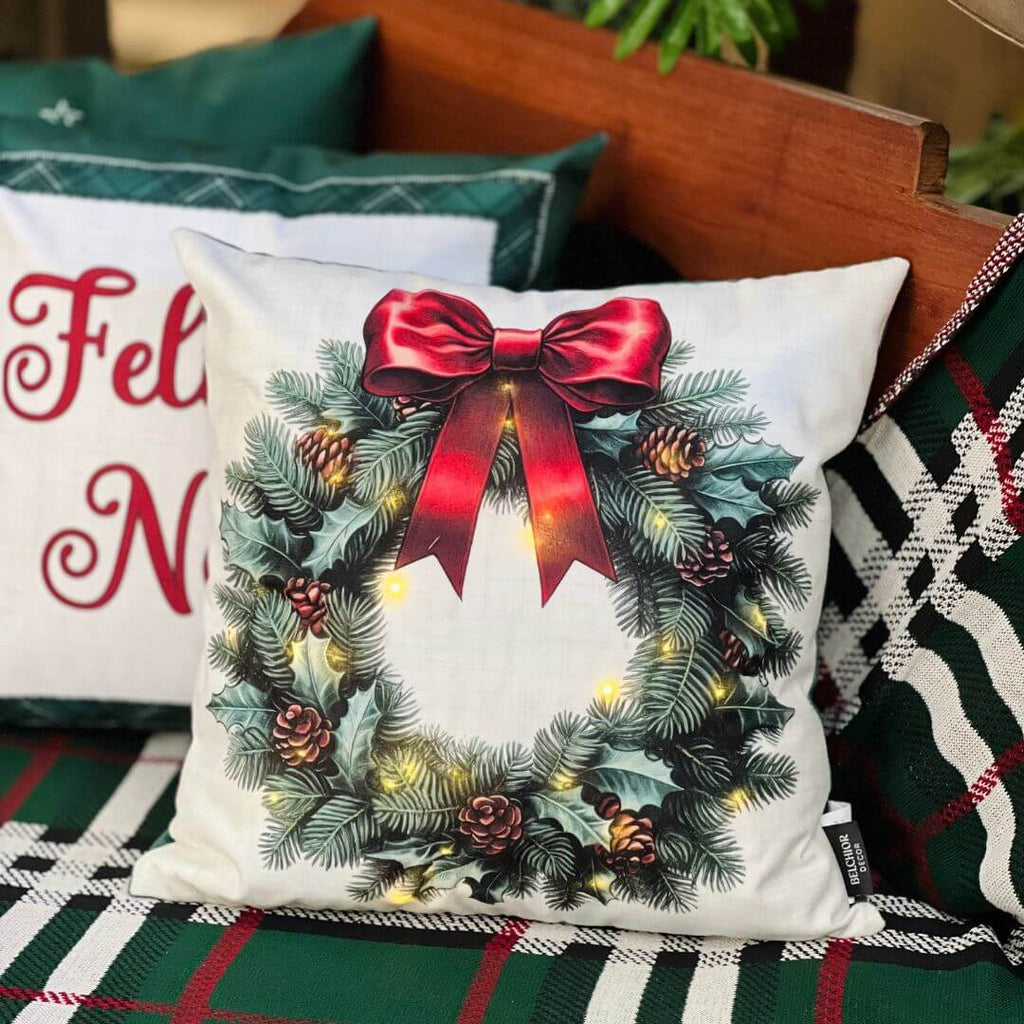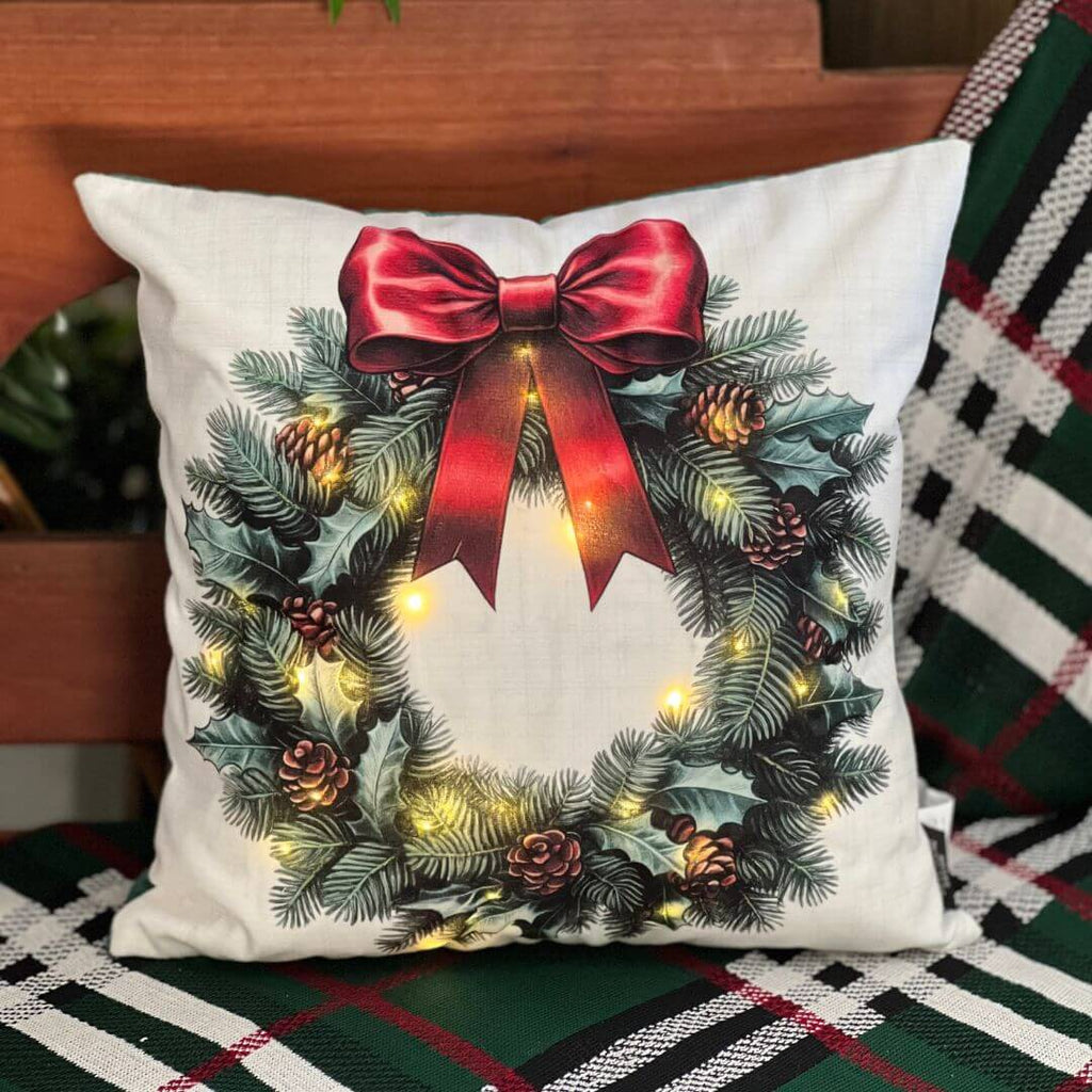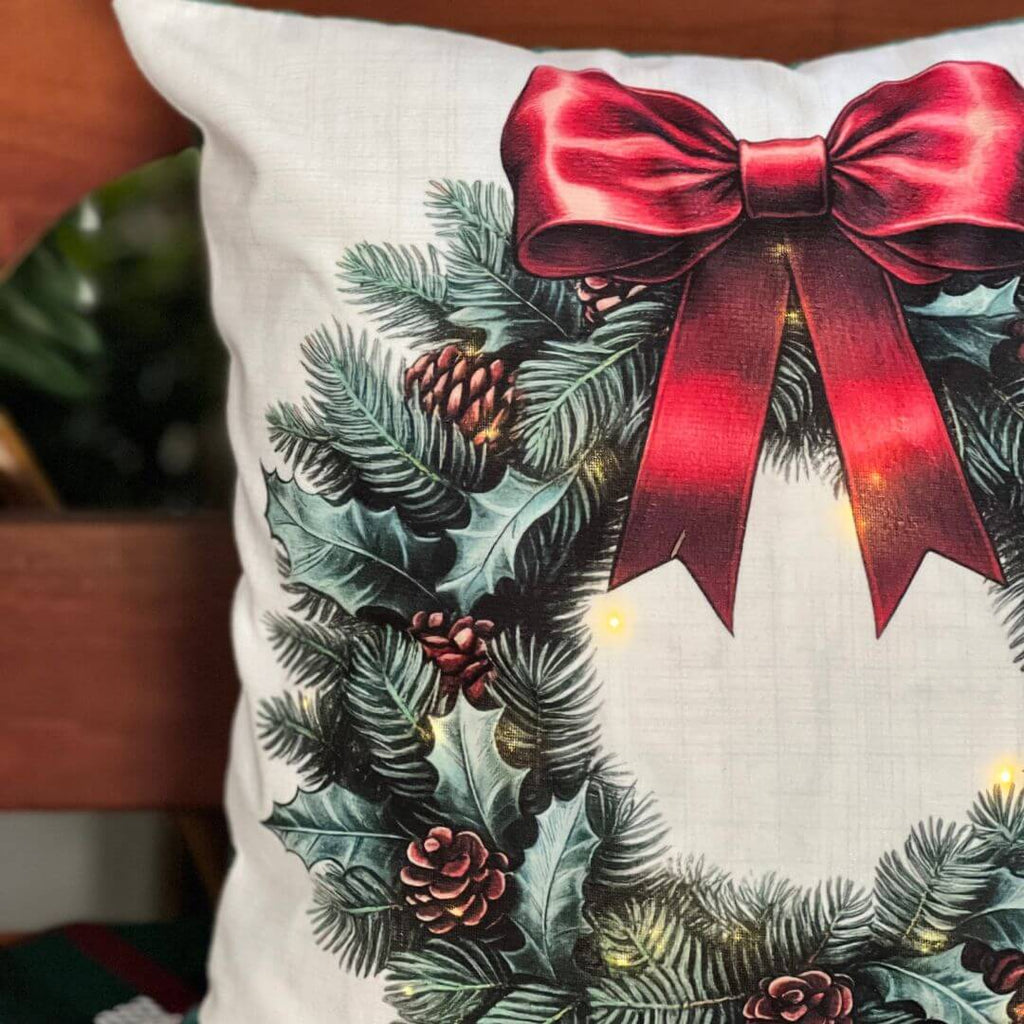 Capa de Almofada Natal em Veludo – Árvore de Natal com Luzes de LED 🎄✨
