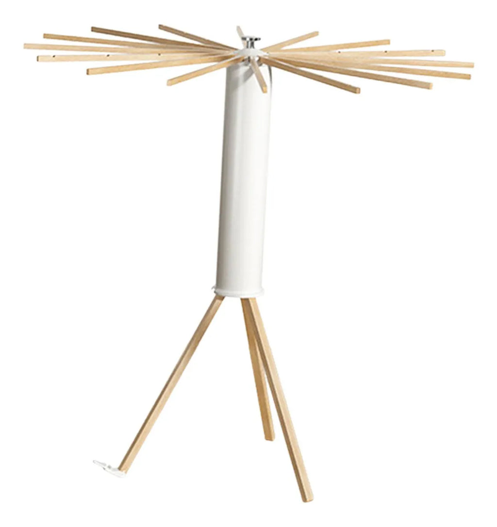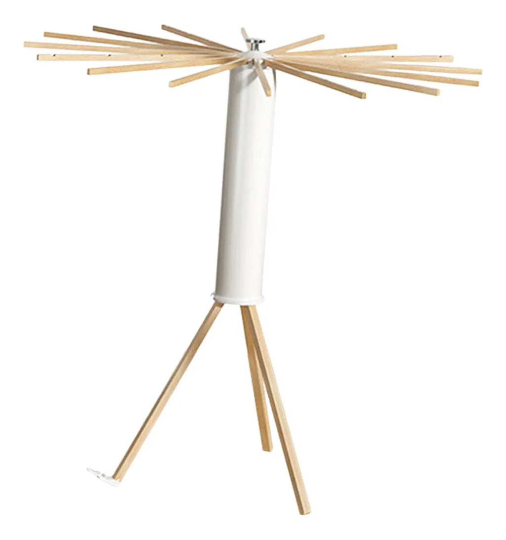 Feito em aço inoxidável com detalhes em PVC e base reforçada em madeira. Suporta roupas molhadas sem risco de tombar.